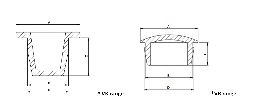 Designed for covering holes in plate work, ideal as cover plugs after anticorrosion treatment. VK parts have a closed bottom; VR parts have a closed top.